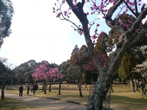 興福寺五重塔から東へ10分ほど歩くと、奈良公園内にあるお花見スポットのひとつ片岡梅林に到着します。円窓亭という建物の周辺に約250本。紅と白どちらもキレイに咲いていました。ベンチもたくさんある場所なのでレジャーシートを持っていなくてもゆっくりお花見できます。お土産屋さんや御手洗も近くにあるのでお子様と一緒のお花見にもオススメです。この辺りは鹿も多く、ごはんをねだりにやってきます。鹿はとてもかわいいのでお弁当など分けてあげたくなりますが、人間の食べ物を与えてはいけません。おなかをこわします。近くの鹿せんべい屋さんをご利用ください。